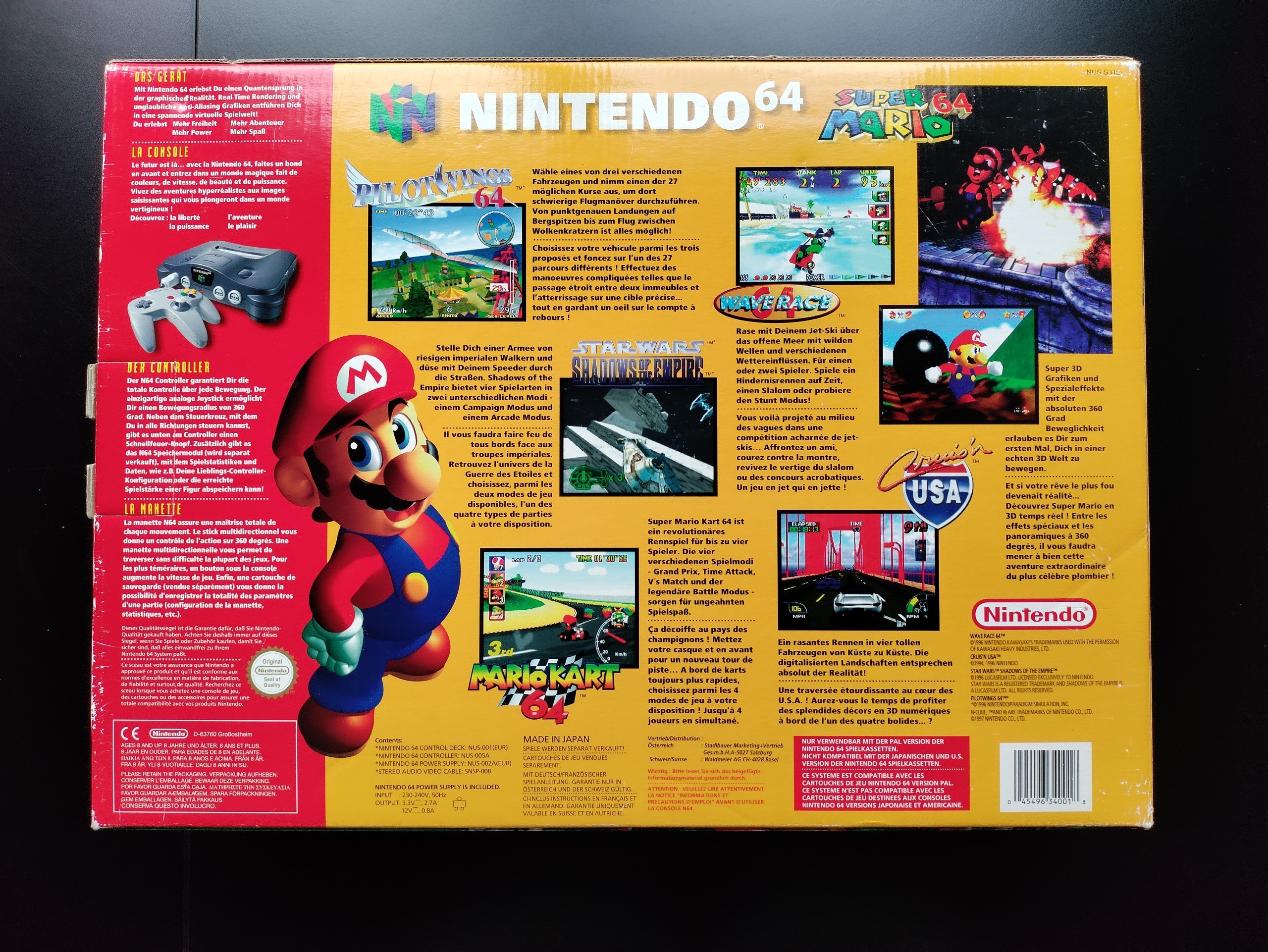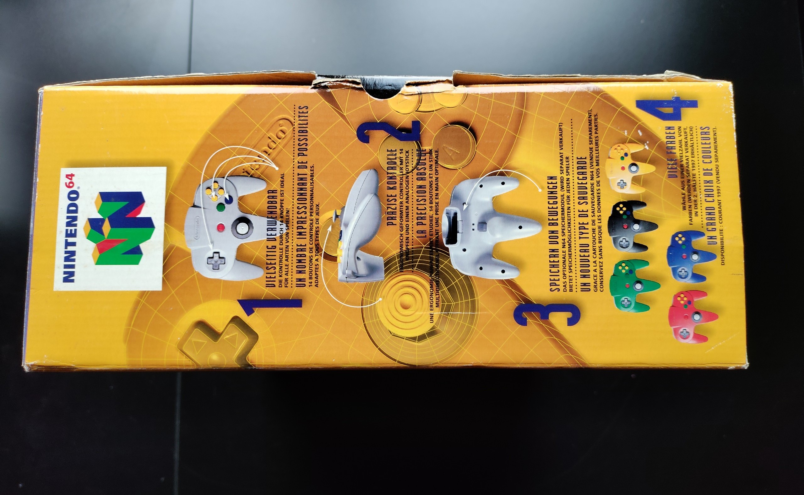 Insgesamt ist das Nintendo 64 in sieben Farben erhältlich - Ocean Blue, Jungle Green, Sun Orange, Atomic Purple, Fire Red, Smoke Black und Clear Blue - ausserdem noch in schwarz... und in einer exklusiven Pokémon Special Edition in gelb und blau mit einem grossen Pikachu oben auf der Konsole...
